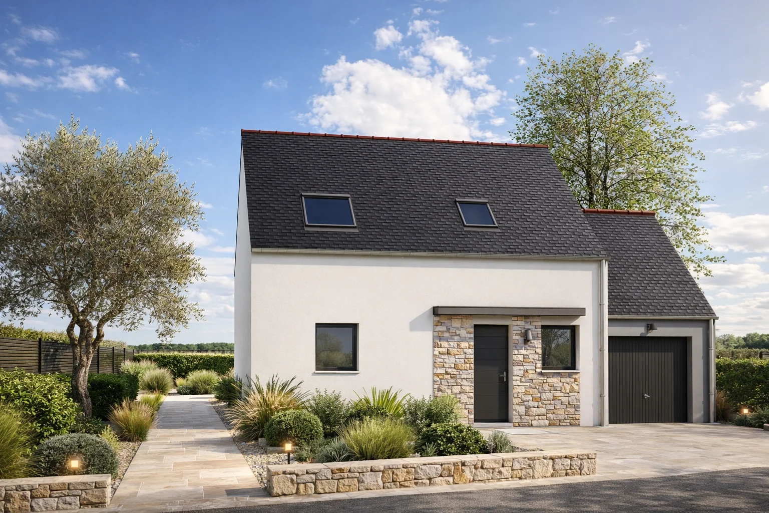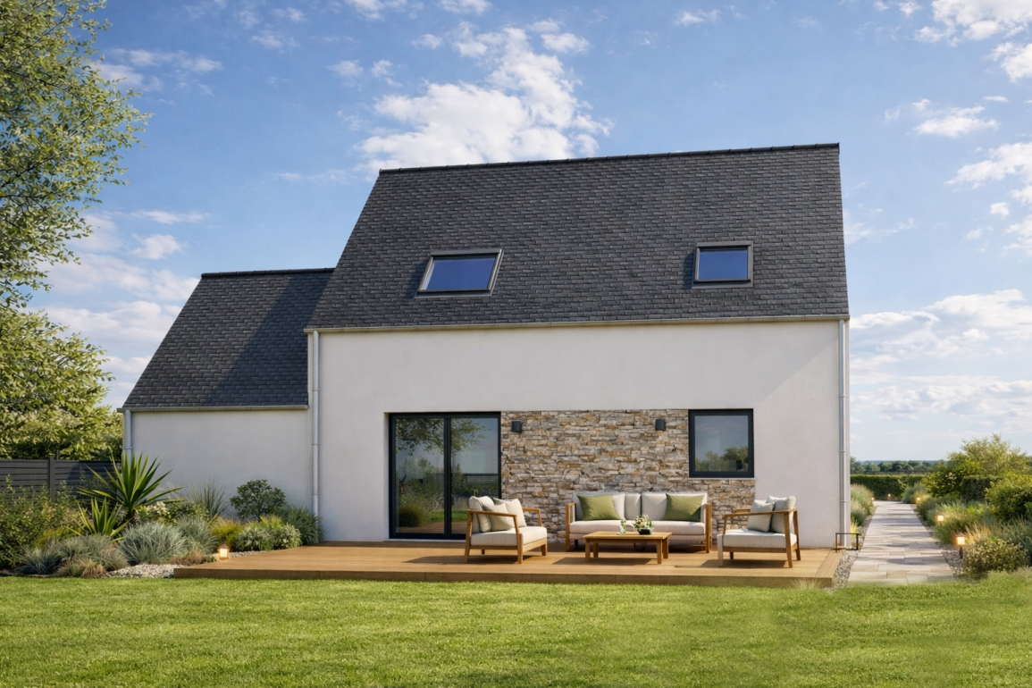 Construction conforme à la norme RE 2025, assurant une haute performance énergétique et une maison à étage durable.