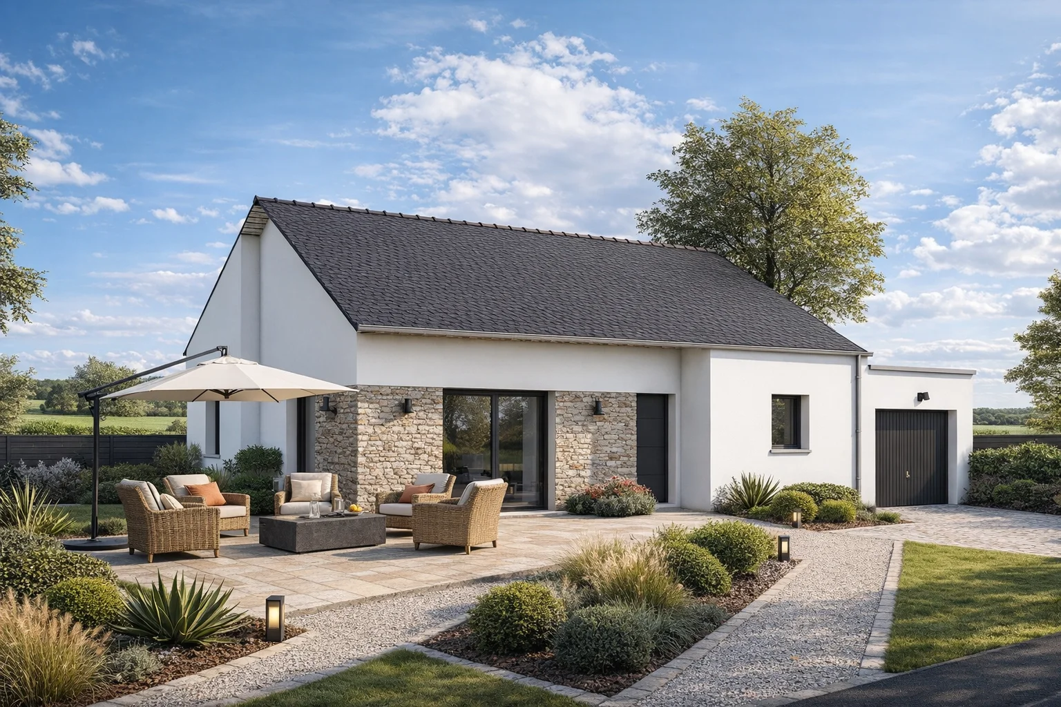 Avec ses 75 m² habitables (92 m² utiles), la maison Plain pied AXCES 11 offre un cadre de vie confortable et fonctionnel, idéal pour une famille en quête d’espace et de modernité. Son agencement de maison plain pied optimisé privilégie la luminosité et le bien-être au quotidien.