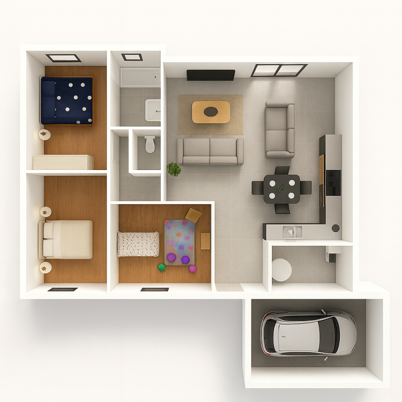 • Une pièce de vie de 43m² avec cuisine ouverte, 3 chambres, sdb, wc,
