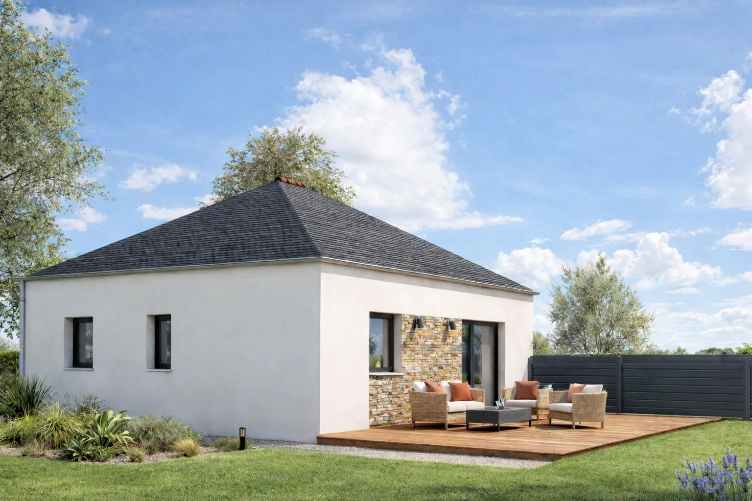 Construction conforme à la norme RE 2020 – seuil 2025, assurant une performance énergétique renforcée pour une maison 2 chambres plus respectueuse de l’environnement.
