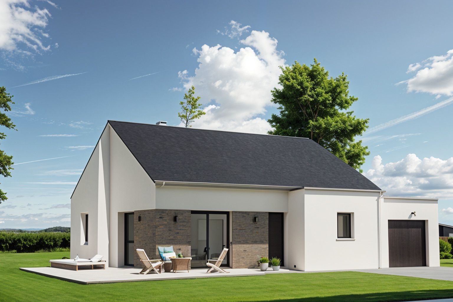 Prix incluant terrain, maison, hors frais de notaire, hors frais annexes et hors adaptation terrain. Hors aménagements intérieurs et extérieurs. Terrain sélectionné et vu pour vous sous réserve de disponibilité et au prix indiqué par notre partenaire foncier. Conditions et visuels non contractuels.