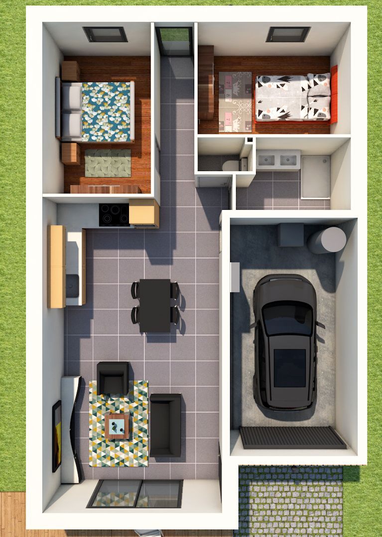 Ce grand espace traversant permet une circulation fluide et une luminosité naturelle grâce à de grandes baies vitrées donnant sur l’extérieur. Ce type de salon offre une agréable vue et une connexion directe avec le jardin ou la terrasse. Situé près de la cuisine pour faciliter l’organisation, le garage peut accueillir des étagères, un lave-linge, des produits ménagers, et du matériel de rangement supplémentaire, et y stationner votre véhicule. 2 chambres, bien orientées, lumineuses et fonctionnelles viennent compléter cette maison RE2020.